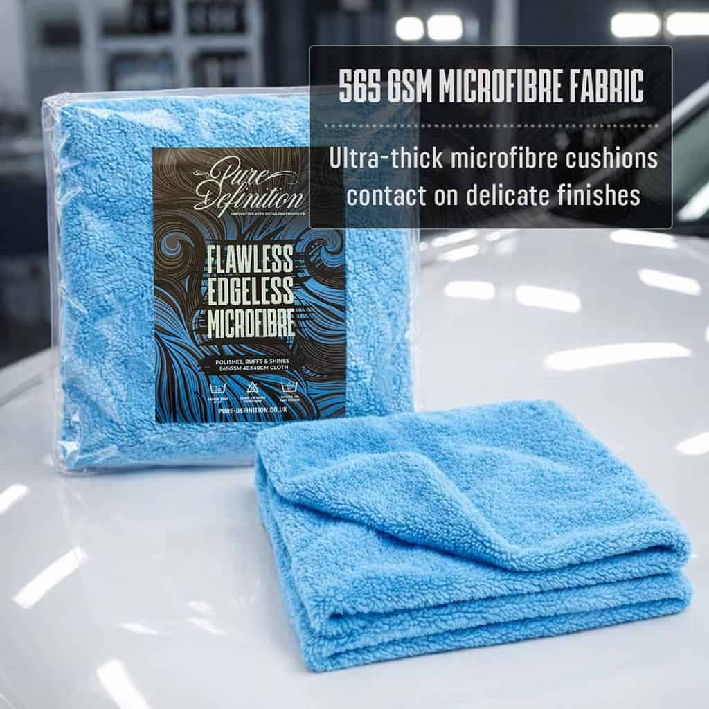 40×40cm 565 GSM – Our edgeless microfibre cloths deliver ultra-plush softness with professional-grade performance. The dense, high-absorbency pile safely lifts dirt, residue, and moisture away from surfaces, helping to minimise swirl marks and micro-marring. Featuring a laser-cut edgeless design for scratch-free use, it glides effortlessly across paintwork, glass, plastics, and trim. Durable, low-lint, and reusable, this versatile cloth is perfect for drying, buffing, ceramic coating removal, and interior or exterior detailing.