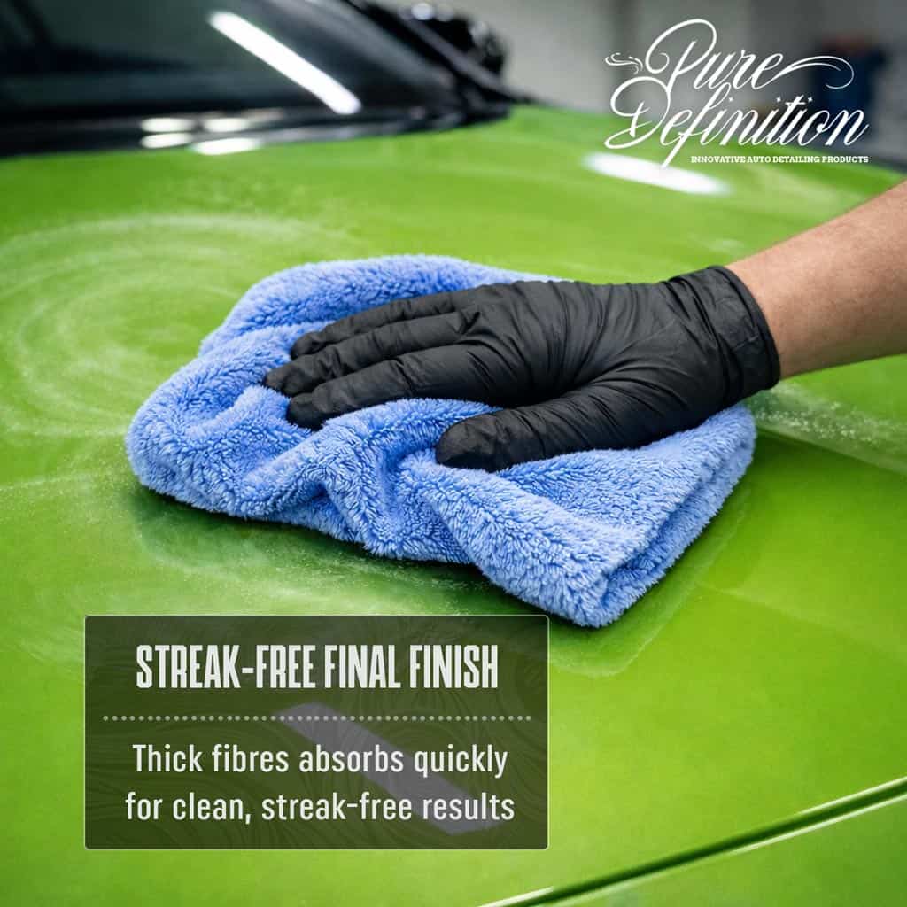 Designed for maximum pickup, the thick microfibre fibres rapidly absorb water, wax residue, polish oils, and detailing sprays. The low-lint structure ensures a clean, streak-free finish—perfect for final buffing, drying stages, ceramic coating removal, and quick detailer wipe-downs.